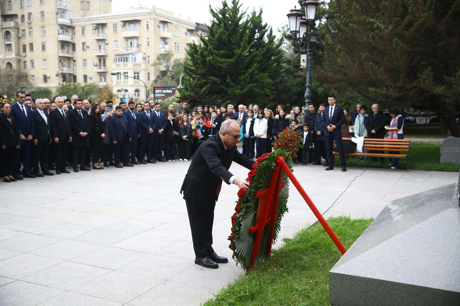 Ulu Öndər Atatürkün xatirəsinin bir dəqiqəlik sükutla anılması və Türkiyə Respublikasının "İstiqlal Marşı"-nın səslənməsinin ardınca Səfir Prof. Dr Birol Akgün adından Parkda yerləşən abidə qarşısına gül çələngi qoyulub.